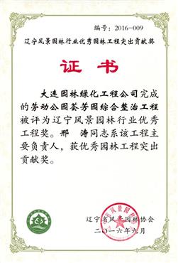 大连园林绿化工程有限公司 - 工程案例 - 2016-邢涛-辽宁风景园林行业******园林工程突出贡献奖